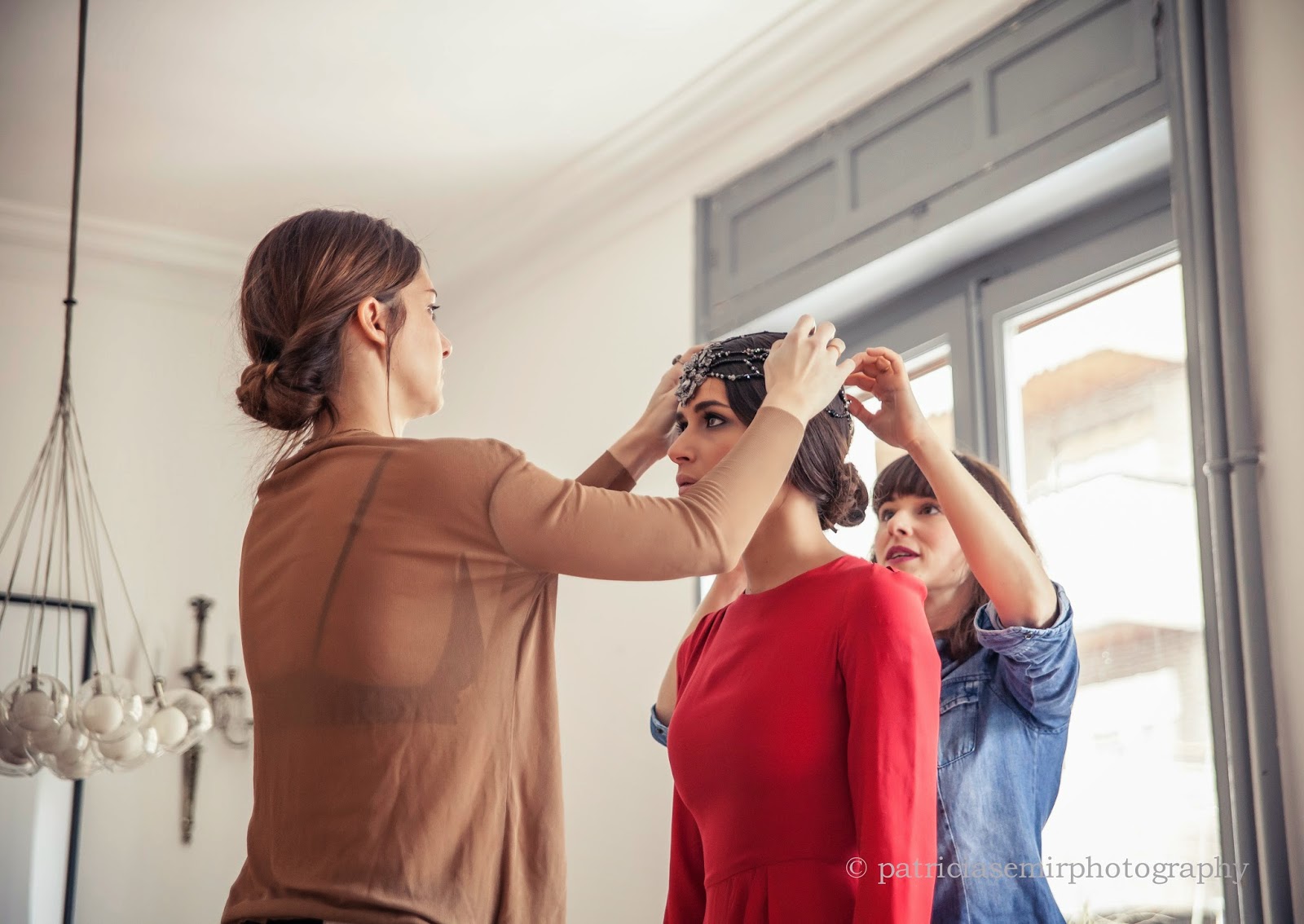 Helena Mareque dando los últimos retoques a los vestidos antes del shooting